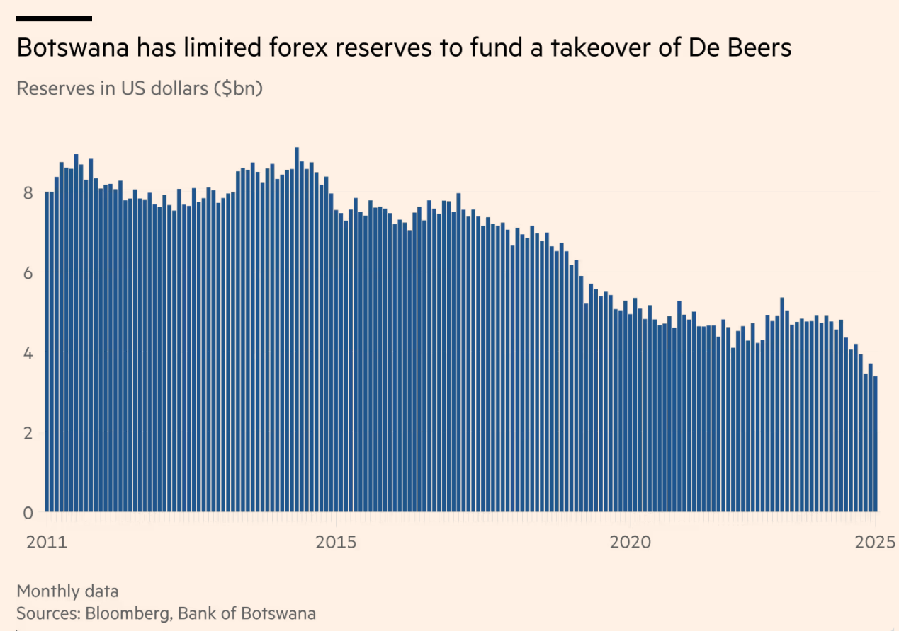 Even at that discounted level, however, Botswana may struggle to finance a bid on its own. The country’s foreign exchange reserves have been eroded by the secular decline of the natural diamond industry (as explained in the rest of this blog), making a Qatari backstop not just helpful, but essential.