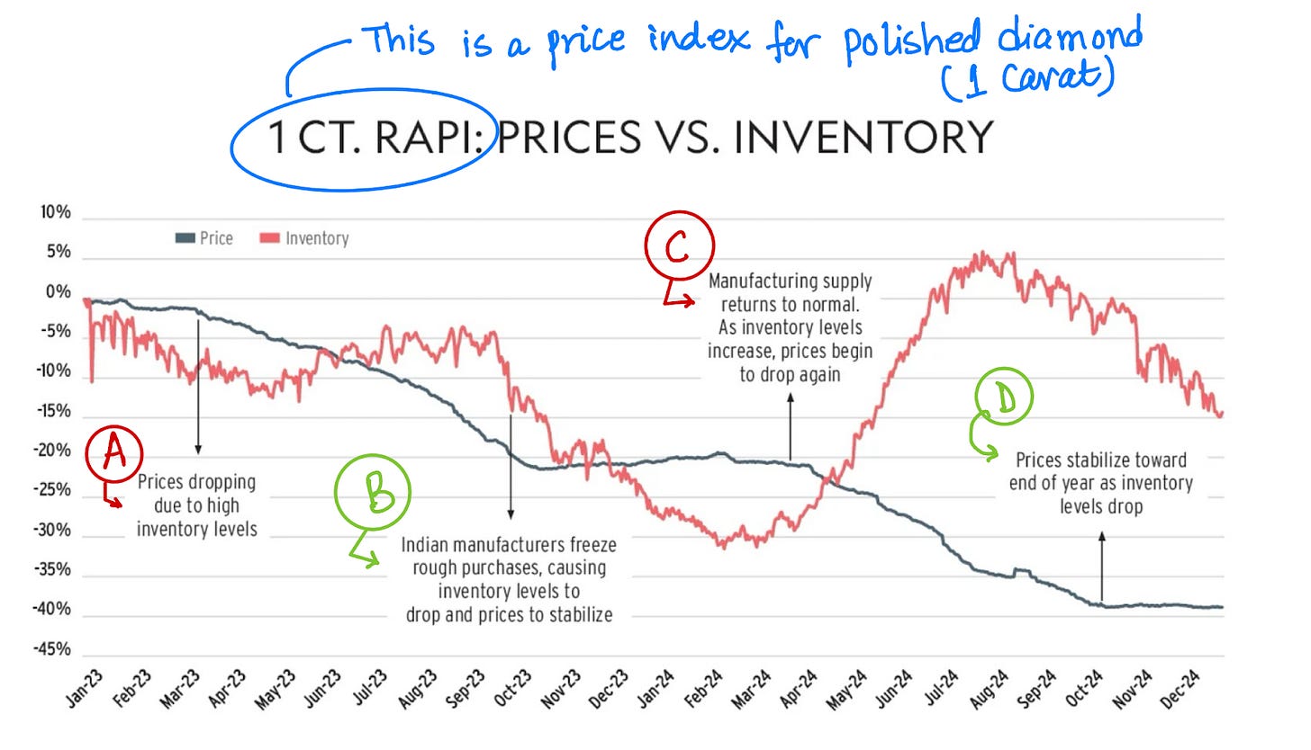 Unlike gold, coffee, or cocoa, diamonds are not exchange-traded commodities. Pricing is opaque, negotiated through networks of miners, polishers, and retailers rather than on open markets. The most widely used benchmark is the Rapaport Diamond Index (RAPI), which tracks asking prices for polished diamonds across categories. Below, I’ve shown an annotated 1-carat RAPI index for polished diamond prices and inventory levels, to show how the industry’s dynamics have played out recently.