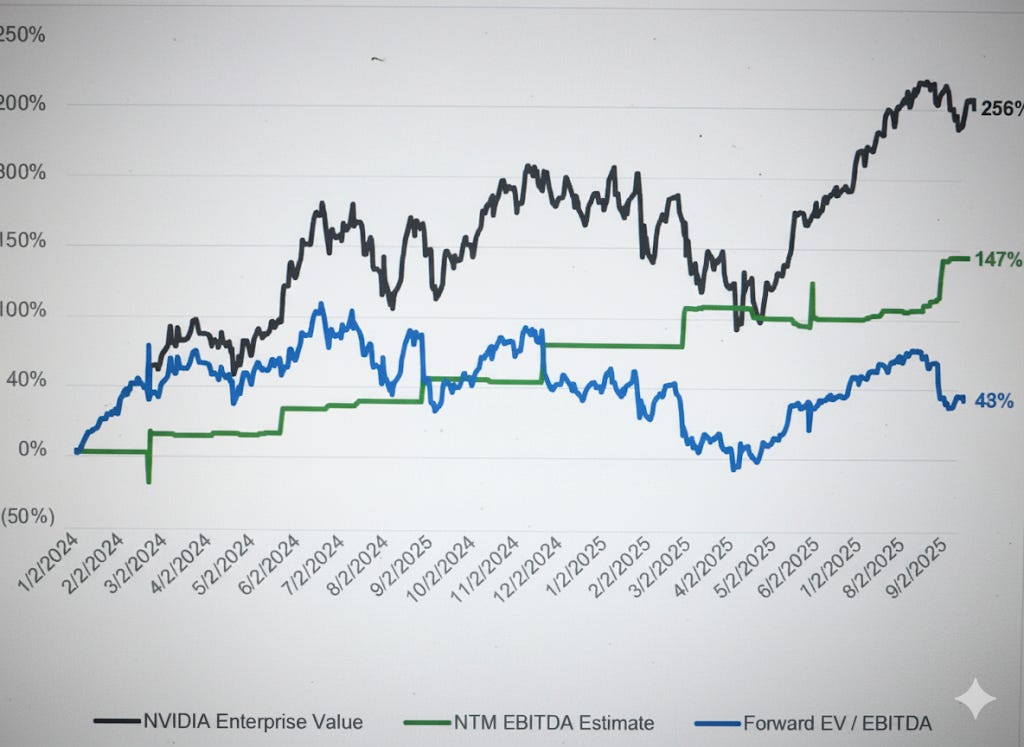 Since Jan 1, 2024, NVIDIA’s NTM EBITDA is up ~147% while the forward EV/EBITDA multiple is up ~43%.
