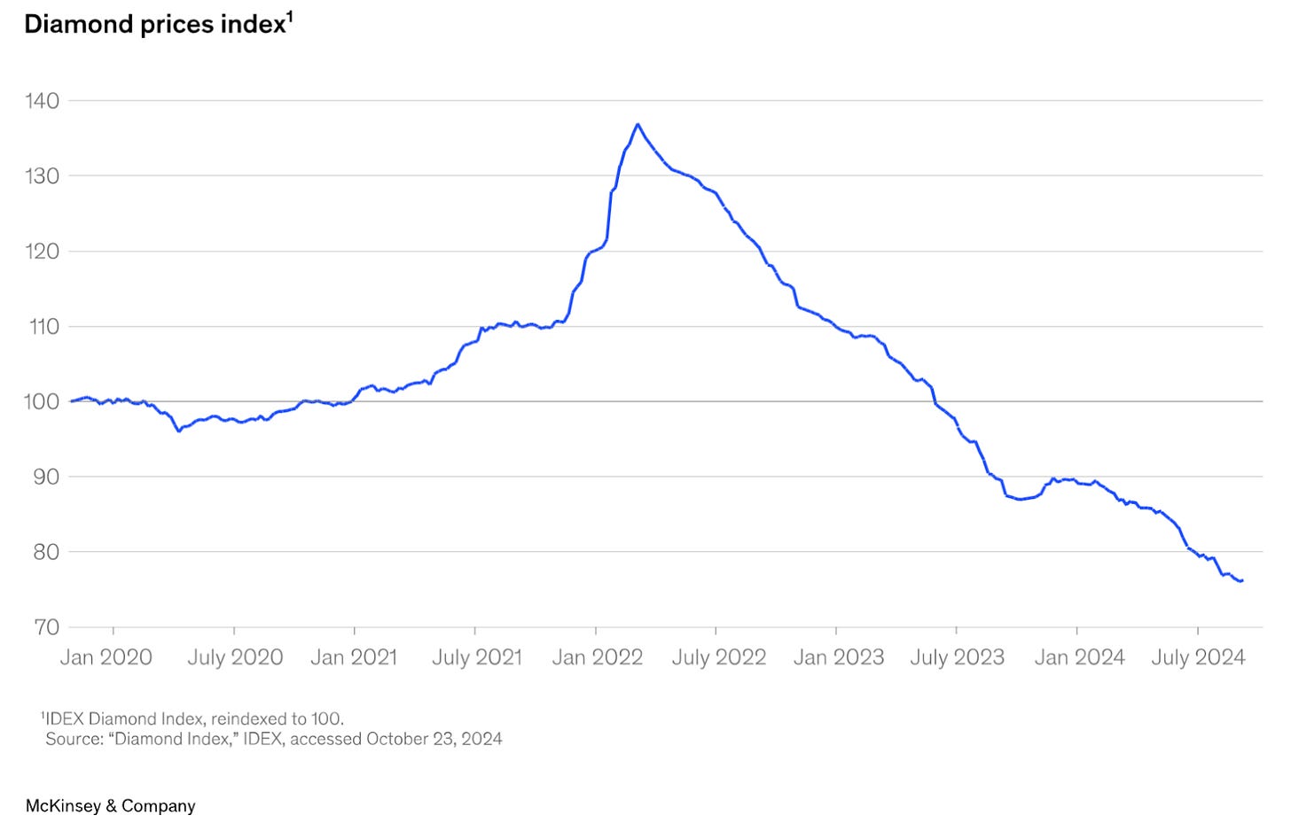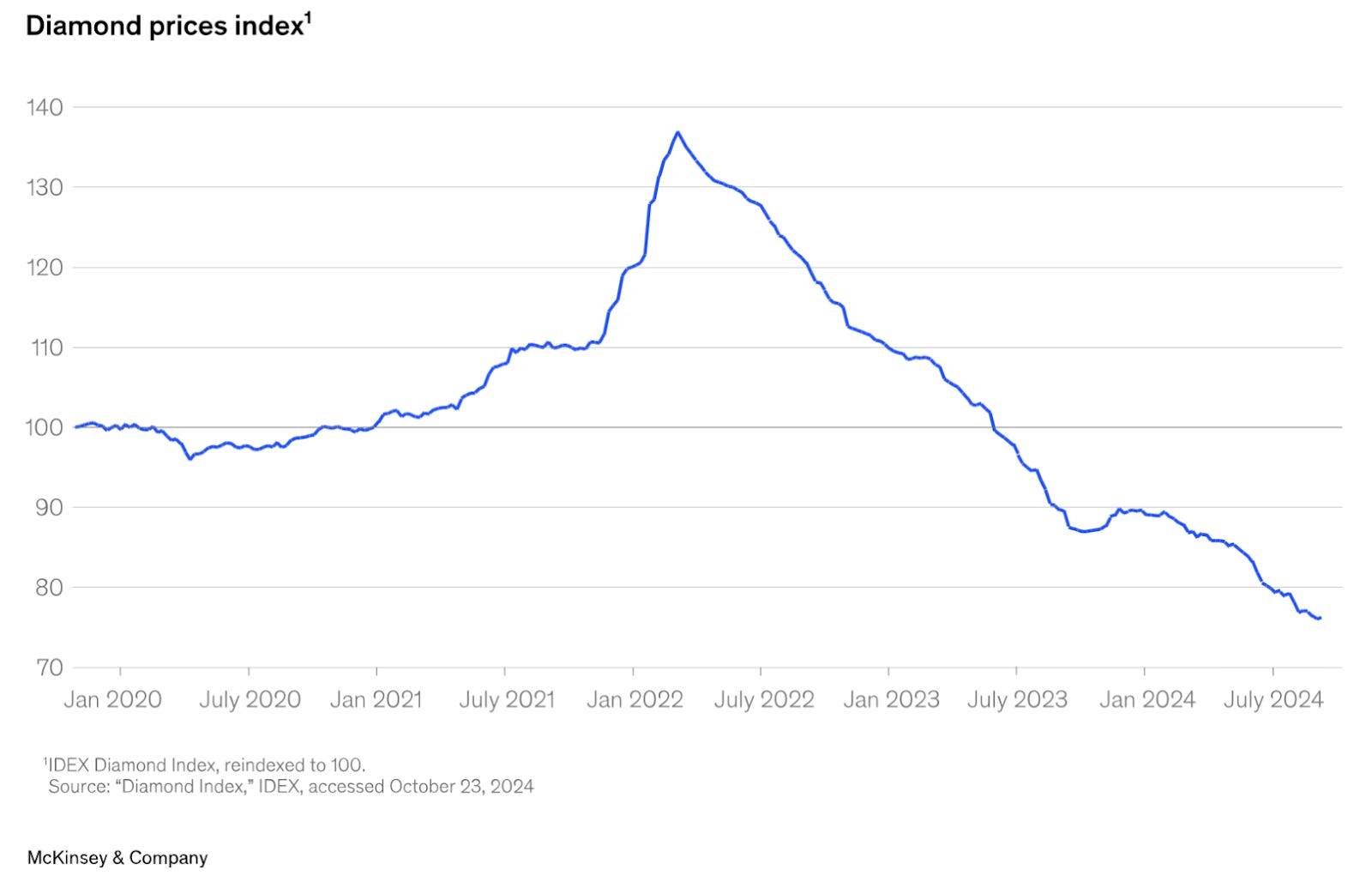 Coming into 2022, retailers had stockpiled polished stones to shield themselves from the wild swings in rough prices seen during COVID. But by late 2022, demand softened sharply — driven by China’s slowdown and the growing penetration of synthetics. With polished inventories already elevated, the market tipped into oversupply and prices fell.
