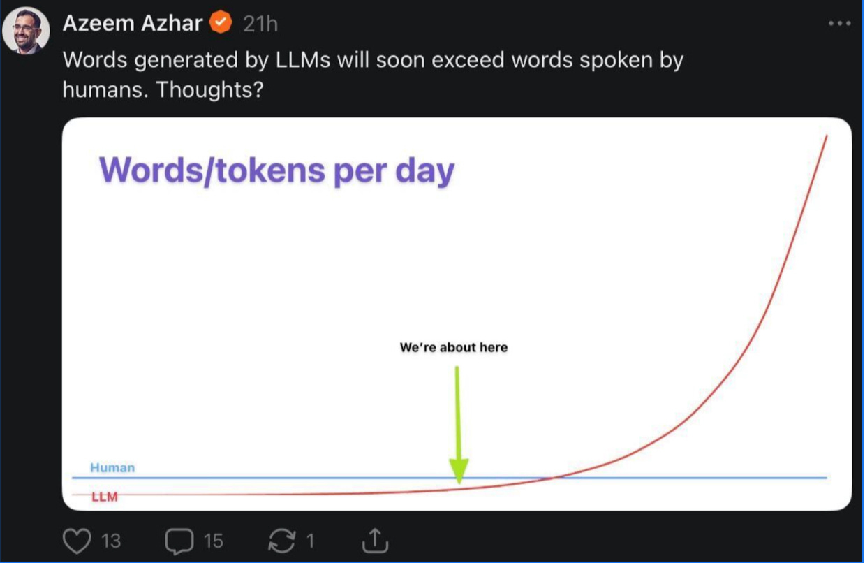 Maybe this is obvious to many, but I found it genuinely mind-blowing that the total words generated by LLMs may soon exceed all spoken words throughout human history. I’m not sure how they estimated the total words ever spoken, but it does seem plausible and simultaneously impressive.