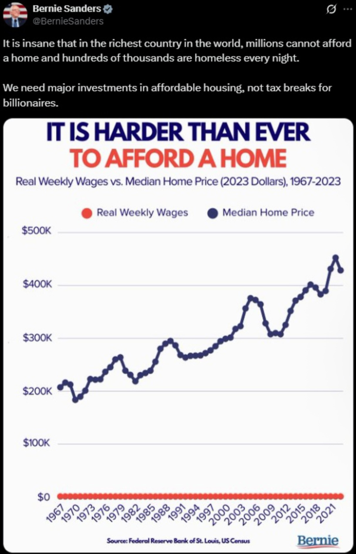 While the drop in housing affordability over the past half century is certainly a problem, it’s not the kind of crisis that Bernie paints it as. Using silly charts in service of alarmist narratives ultimately just weakens trust in your movement — or at least, it should.