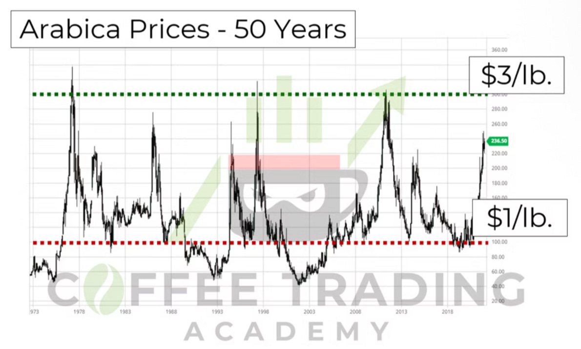 As shown in the chart below, over a fifty year period, Arabica has generally traded in a tight window of between $1 - $3 / lb. The band holds because roasters can substitute toward Robusta when Arabica gets expensive, which cools demand for Arabica. When prices fall and futures sit above today’s price, traders and exporters are rewarded to store beans, so a bit less coffee hits the market right away and prices stabilize.