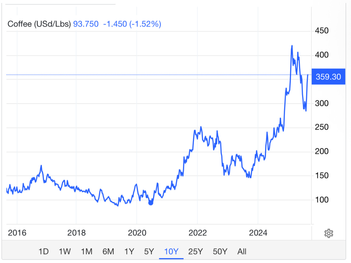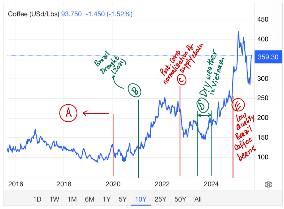 Net result: a two-bean squeeze—Brazilian Arabica stress + Vietnamese Robusta stress—on top of thin stocks. That’s how the market punched above the historical $1–$3/lb band and printed $3.50+.