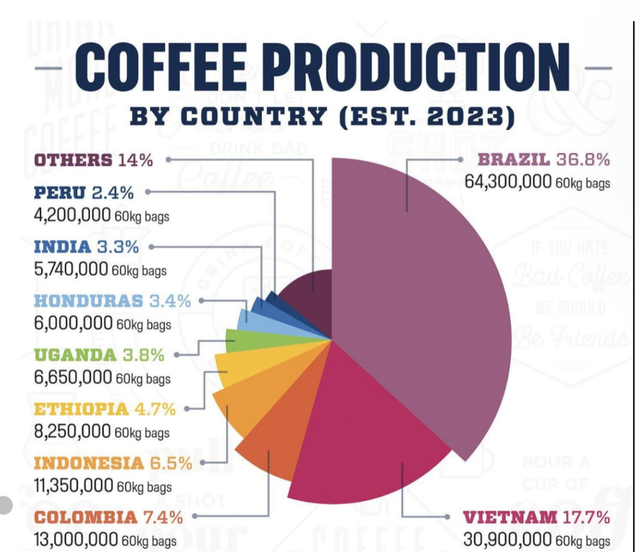 Brazil and Vietnam are the heavyweights, together accounting for over 50% of global production. So, you could say, Brazil and Vietnam are to coffee what OPEC is to oil. And while Brazil mainly produces Arabica, Vietnam almost exclusively produces Robusta.