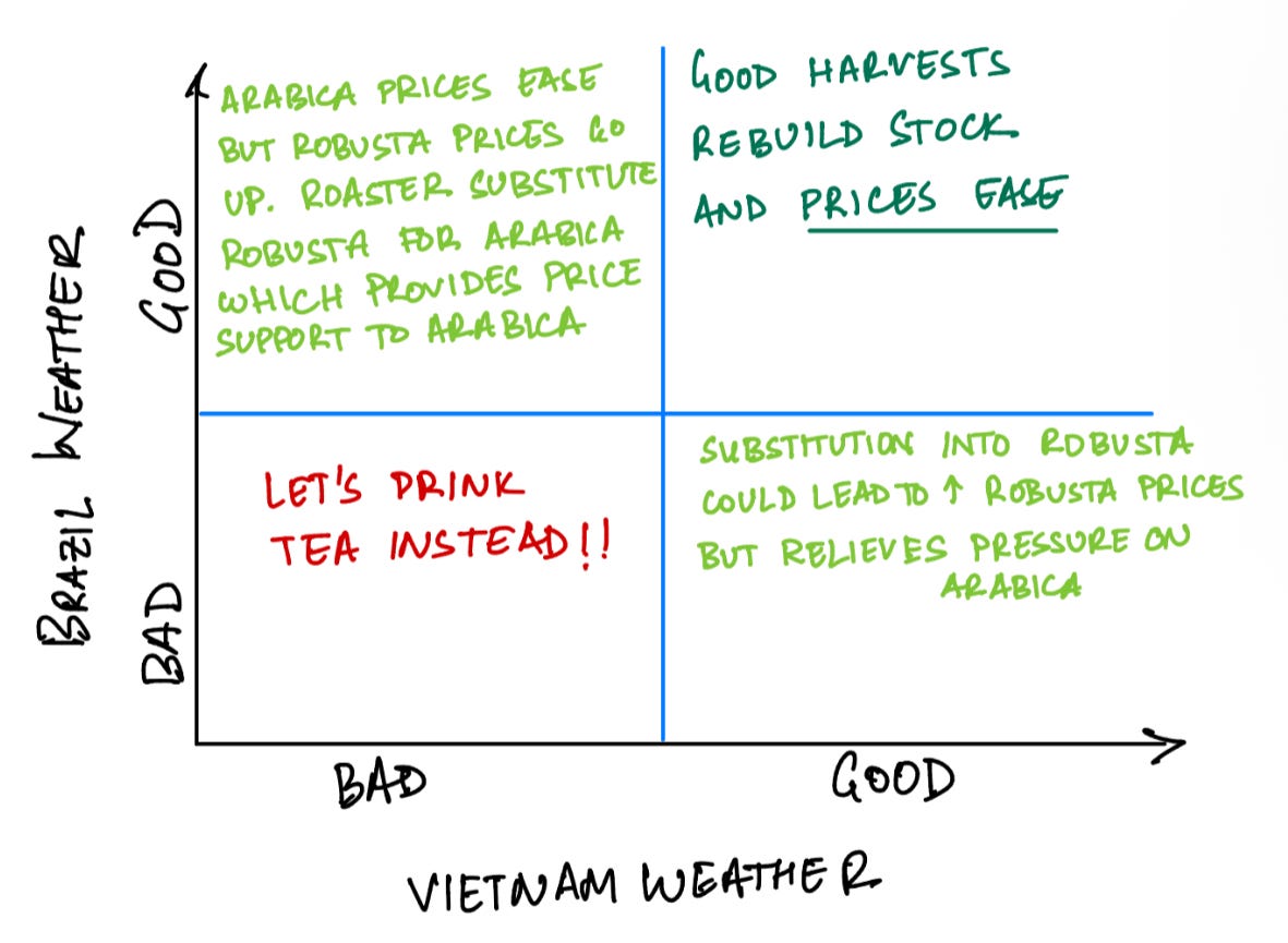 Here is a 2x2 matrix of what the “coffee weather” may do to coffee bean prices.