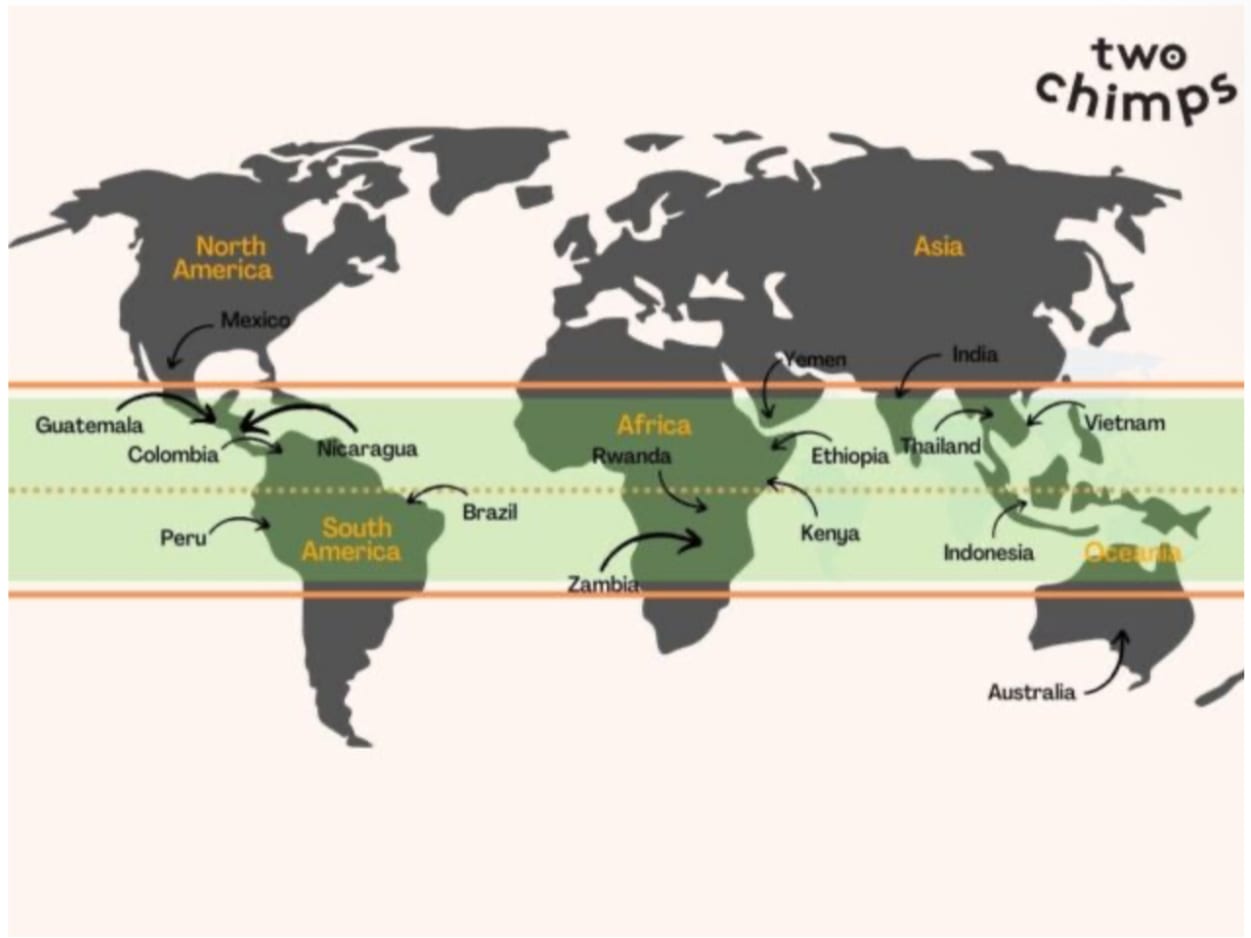 Coffee production is ideal in warm climates close to the equator - the region between 30 degrees north and 25 degrees south of the equator - is thus also called the “coffee belt” - the ideal region.